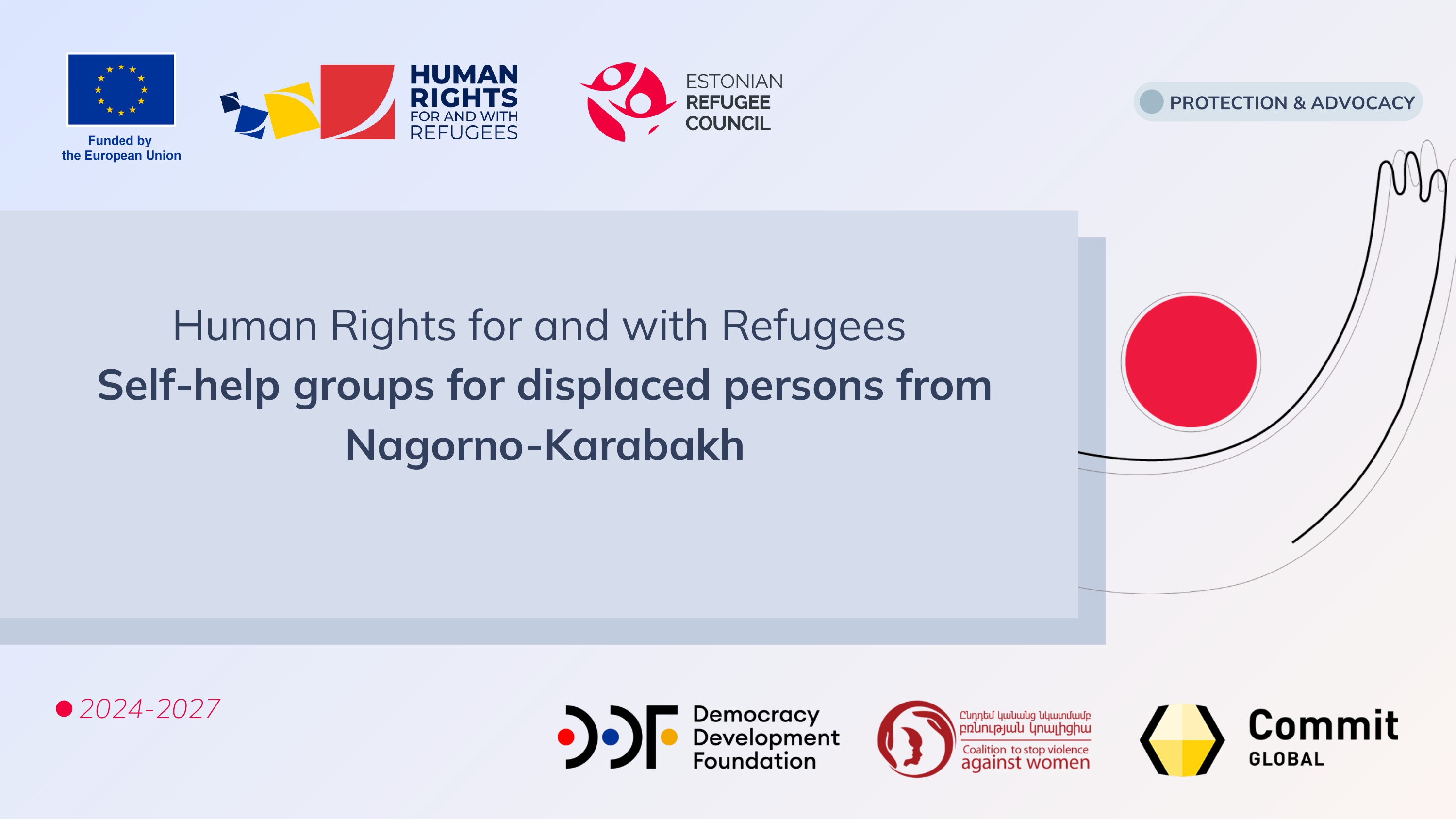"Human Rights for and with Refugees" project is implemented with the support of the European Union by Democracy Development Foundation, Estonian Refugee Council, Coalition to Stop Violence Against Women, and Commit Global. The project focuses on empowering refugees from Nagorno Karabakh by providing essential knowledge about their rights, addressing vulnerabilities, and improving access to user-friendly resources on their entitlements and opportunities.